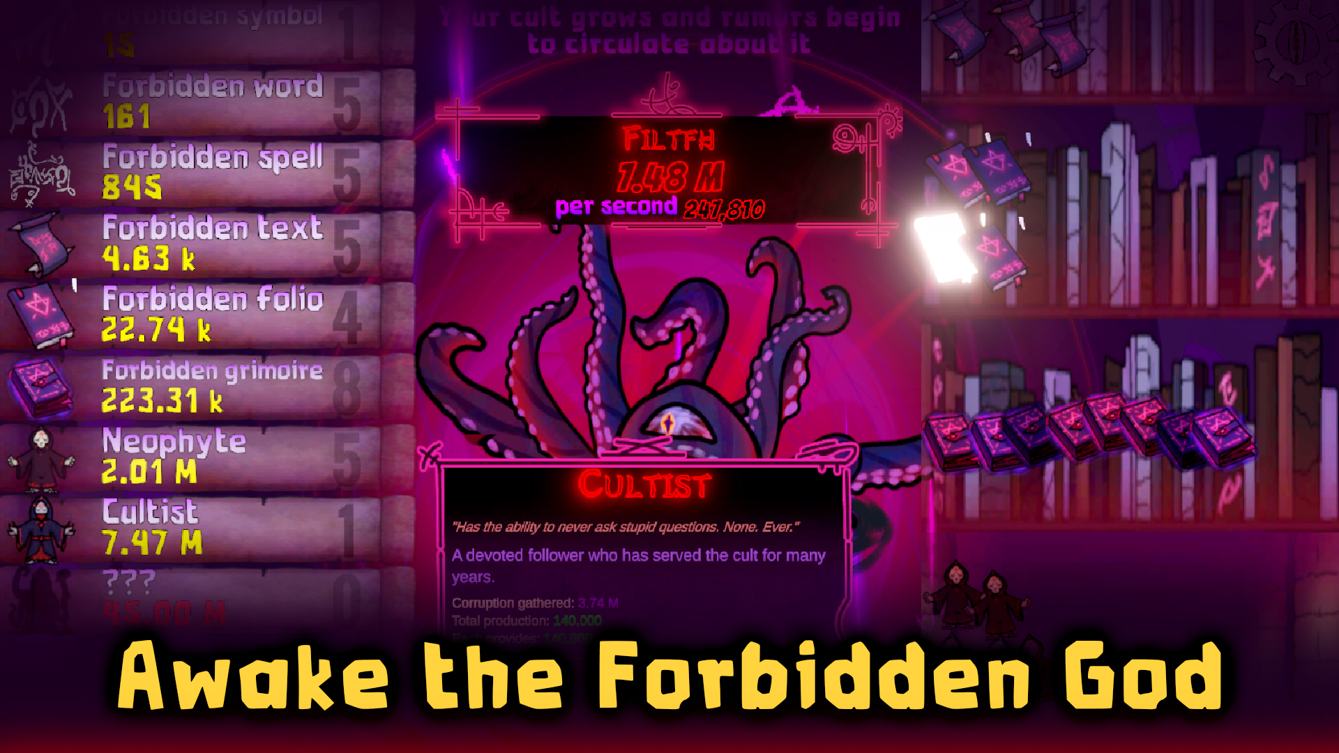 Over time, your arsenal will expand, and you will learn to conduct forbidden rites to magnify Him even more. After that, you will begin attracting new followers and spreading your influence, ultimately plunging first your city, then the entire planet, into darkness.